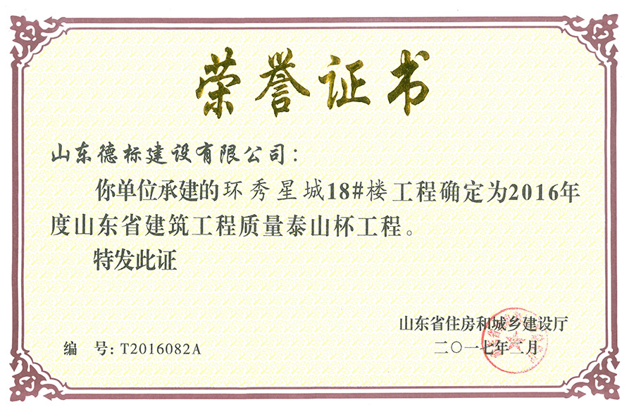 2016年度山東省建筑工程質(zhì)量泰山杯-環(huán)秀18#樓