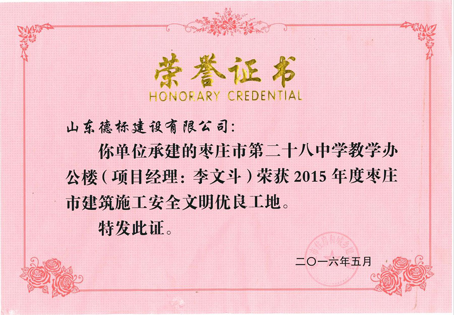 2015年度市安全文明優(yōu)良工地-棗莊市二十八中教學(xué)辦公樓